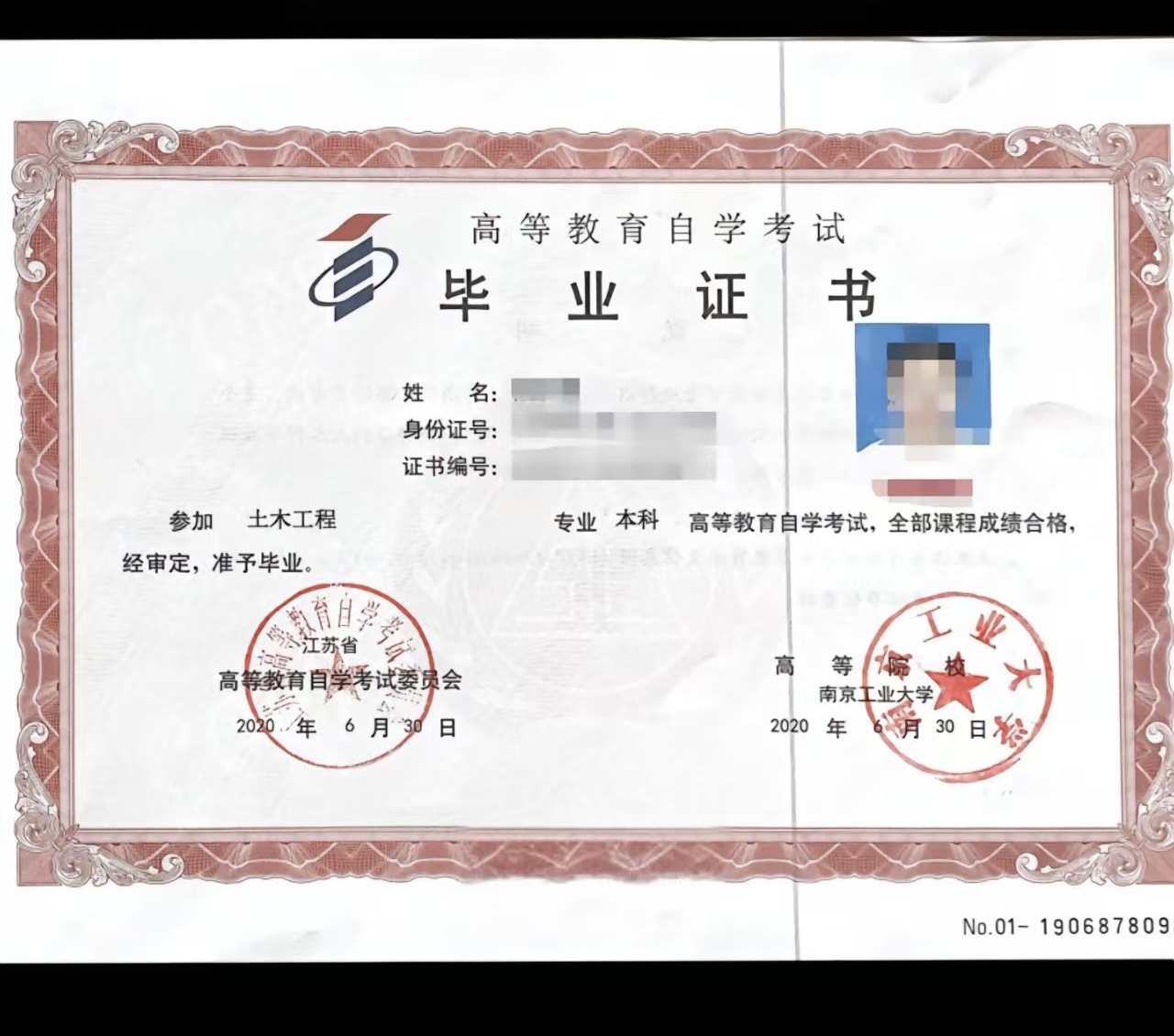 1、毕业条件:修完考试计划所规定的全部课程,考试合格,并且通过毕业论文(设计)答辩,发放由江苏省高等教育自学考试委员会和南京工业大学合署的毕业证书,教育部电子注册。